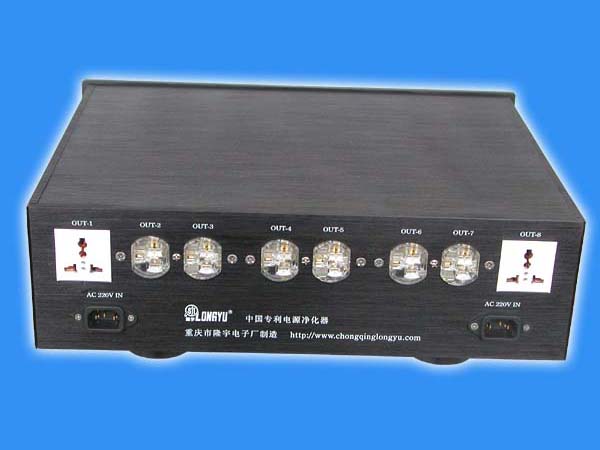 本机采用黑色全精铝镶嵌式机箱,面板上装有实时监视电网电压的数字电压表。机后配置的OUT1—OUT8,是八路相互隔离的电源输出插座,每路提供240倍频10A(15A)的宽带净化电流。OUT1—OUT6四路均为美标插座,OUT7、OUT8为万用插座。